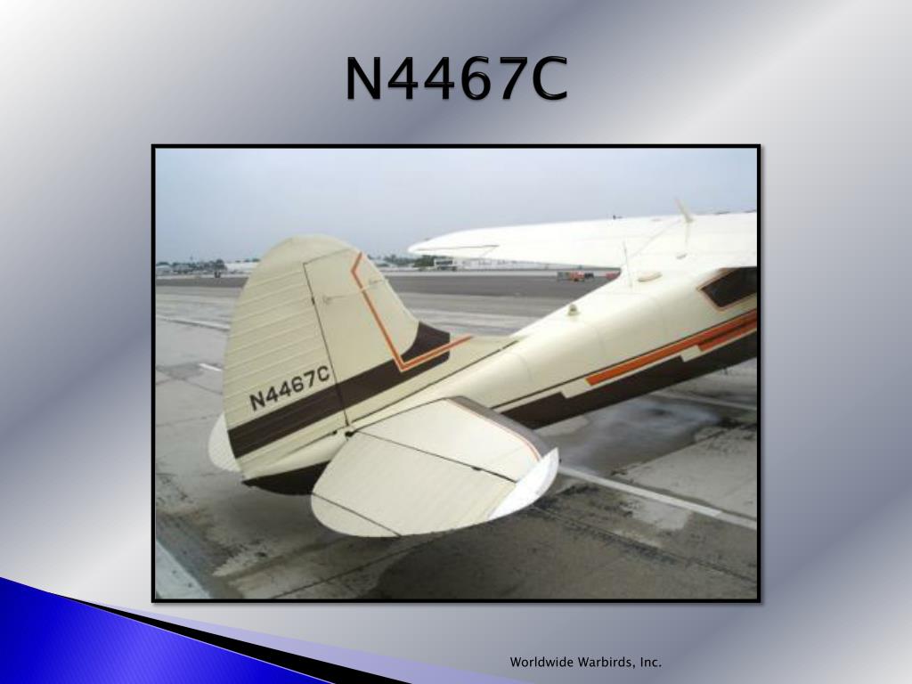N4467C • GENERAL INFORMATION • Beautiful and rare, this aircraft was built for luxury • Fewer than 100 flying today! • Always hangared and well maintained • Logbooks complete from first test flight Worldwide Warbirds, Inc.