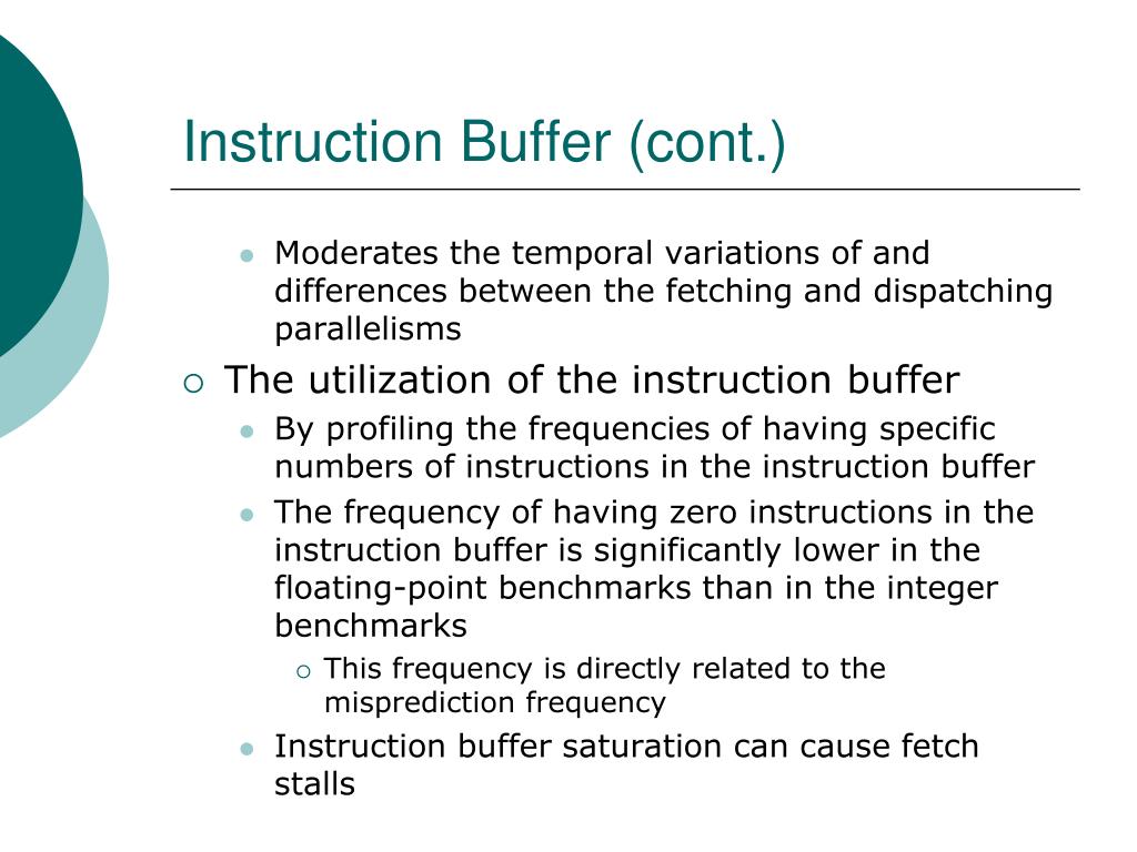 Instruction Buffer (cont.) • Moderates the temporal variations of and differences between the fetching and dispatching parallelisms • The utilization of the instruction buffer • By profiling the frequencies of having specific numbers of instructions in the instruction buffer • The frequency of having zero instructions in the instruction buffer is significantly lower in the floating-point benchmarks than in the integer benchmarks • This frequency is directly related to the misprediction frequency • Instruction buffer saturation can cause fetch stalls