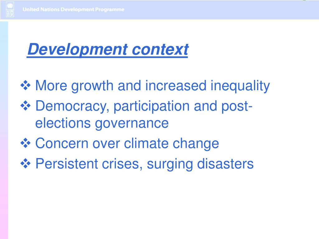 More growth and increased inequality • Democracy, participation and post-elections governance • Concern over climate change • Persistent crises, surging disasters Development context