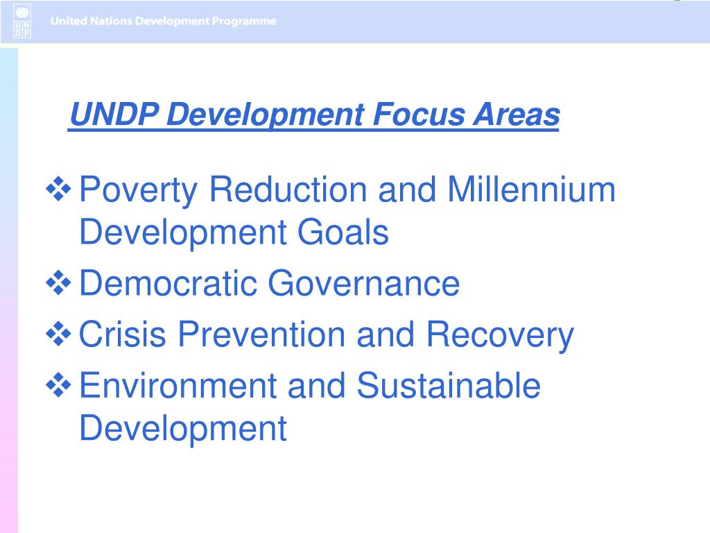 Poverty Reduction and Millennium Development Goals • Democratic Governance • Crisis Prevention and Recovery • Environment and Sustainable Development UNDP Development Focus Areas