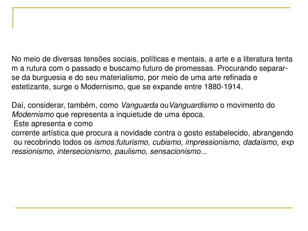 No meio de diversas tensões sociais, políticas e mentais, a arte e a literatura tentam a rutura com o passado e buscamo futuro de promessas. Procurando separar-se da burguesia e do seu materialismo, por meio de uma arte refinada e estetizante, surge o Modernismo, que se expande entre 1880-1914. Daí, considerar, também, como Vanguarda ouVanguardismo o movimento do Modernismo que representa a inquietude de uma época. Este apresenta e como corrente artística que procura a novidade contra o gosto estabelecido, abrangendo ou recobrindo todos os ismos:futurismo, cubismo, impressionismo, dadaísmo, expressionismo, intersecionismo, paulismo, sensacionismo...