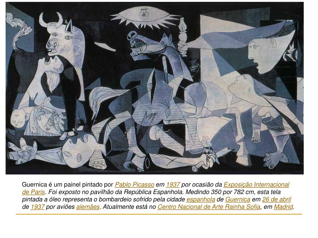 Guernica é um painel pintado por Pablo Picasso em 1937 por ocasião da Exposição Internacional de Paris. Foi exposto no pavilhão da República Espanhola. Medindo 350 por 782 cm, esta tela pintada a óleo representa o bombardeio sofrido pela cidade espanhola de Guernica em 26 de abril de 1937 por aviões alemães. Atualmente está no Centro Nacional de Arte Rainha Sofia, em Madrid.