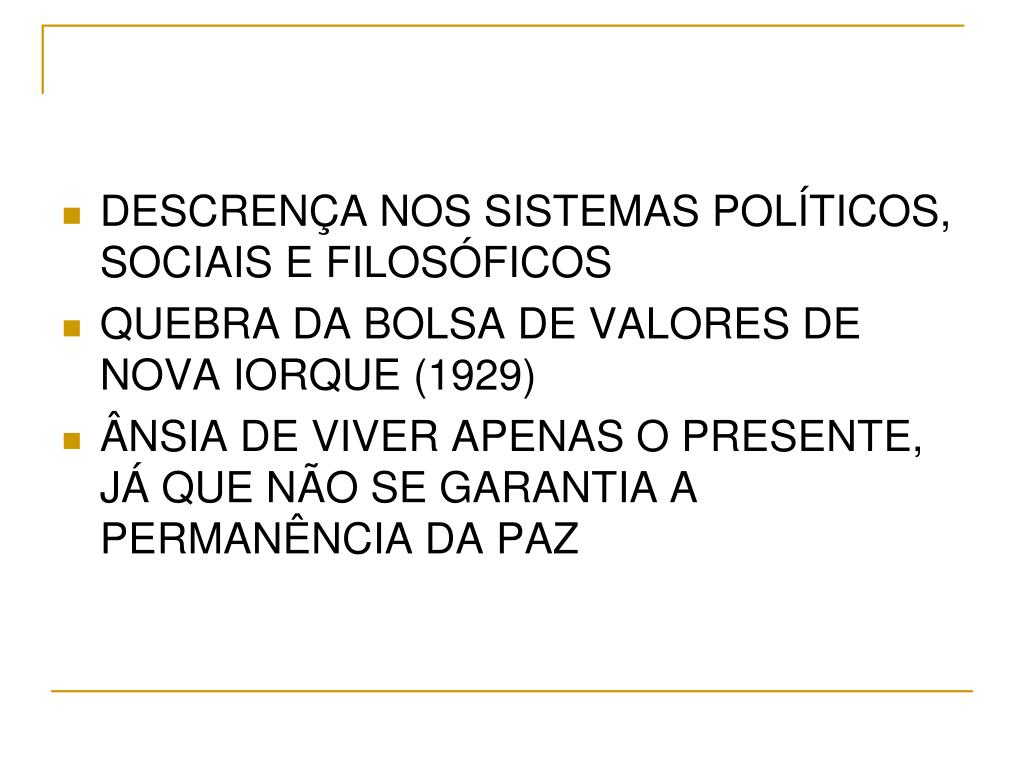DESCRENÇA NOS SISTEMAS POLÍTICOS, SOCIAIS E FILOSÓFICOS • QUEBRA DA BOLSA DE VALORES DE NOVA IORQUE (1929) • ÂNSIA DE VIVER APENAS O PRESENTE, JÁ QUE NÃO SE GARANTIA A PERMANÊNCIA DA PAZ