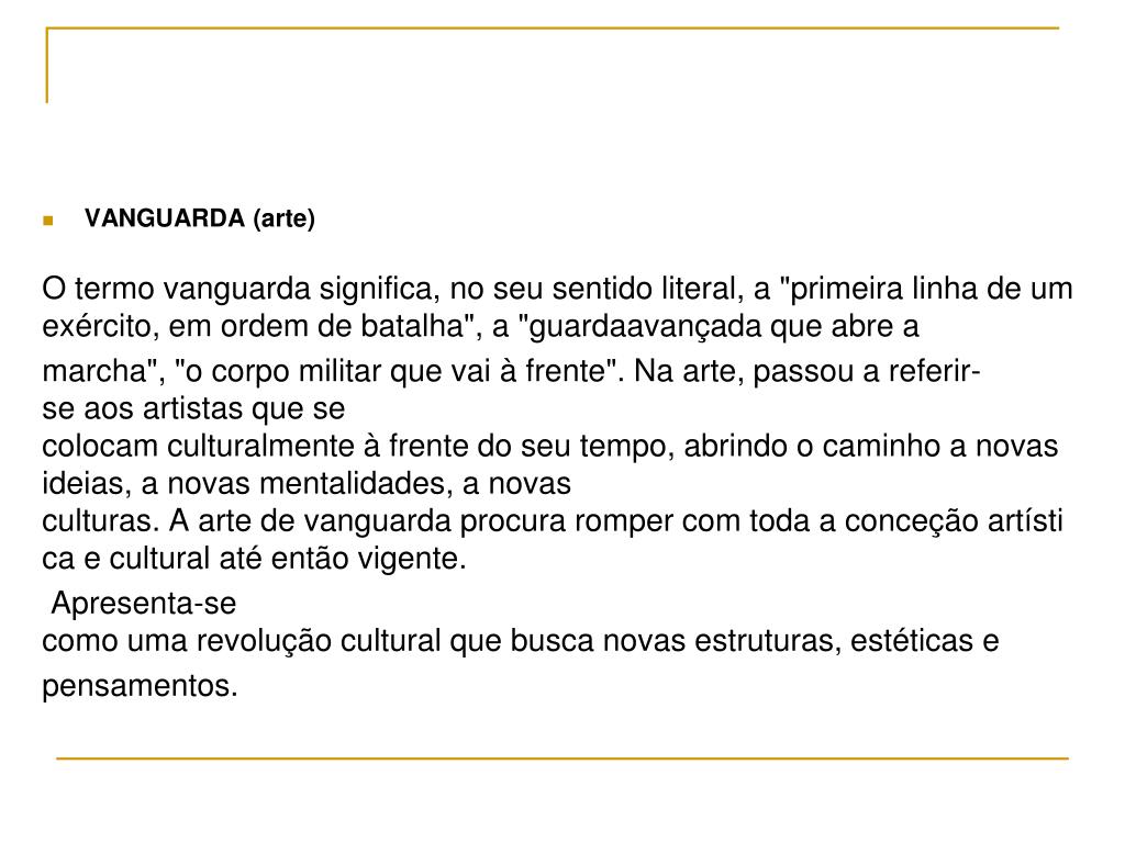 VANGUARDA (arte) O termo vanguarda significa, no seu sentido literal, a "primeira linha de umexército, em ordem de batalha", a "guardaavançada que abre a marcha", "o corpo militar que vai à frente". Na arte, passou a referir-se aos artistas que se colocam culturalmente à frente do seu tempo, abrindo o caminho a novas ideias, a novas mentalidades, a novas culturas. A arte de vanguarda procura romper com toda a conceção artística e cultural até então vigente. Apresenta-se como uma revolução cultural que busca novas estruturas, estéticas e pensamentos.