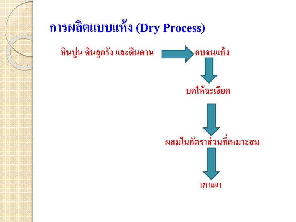การผลิตแบบแห้ง (Dry Process) หินปูน ดินลูกรัง และดินดาน อบจนแห้ง บดให้ละเอียด ผสมในอัตราส่วนที่เหมาะสม เตาเผา