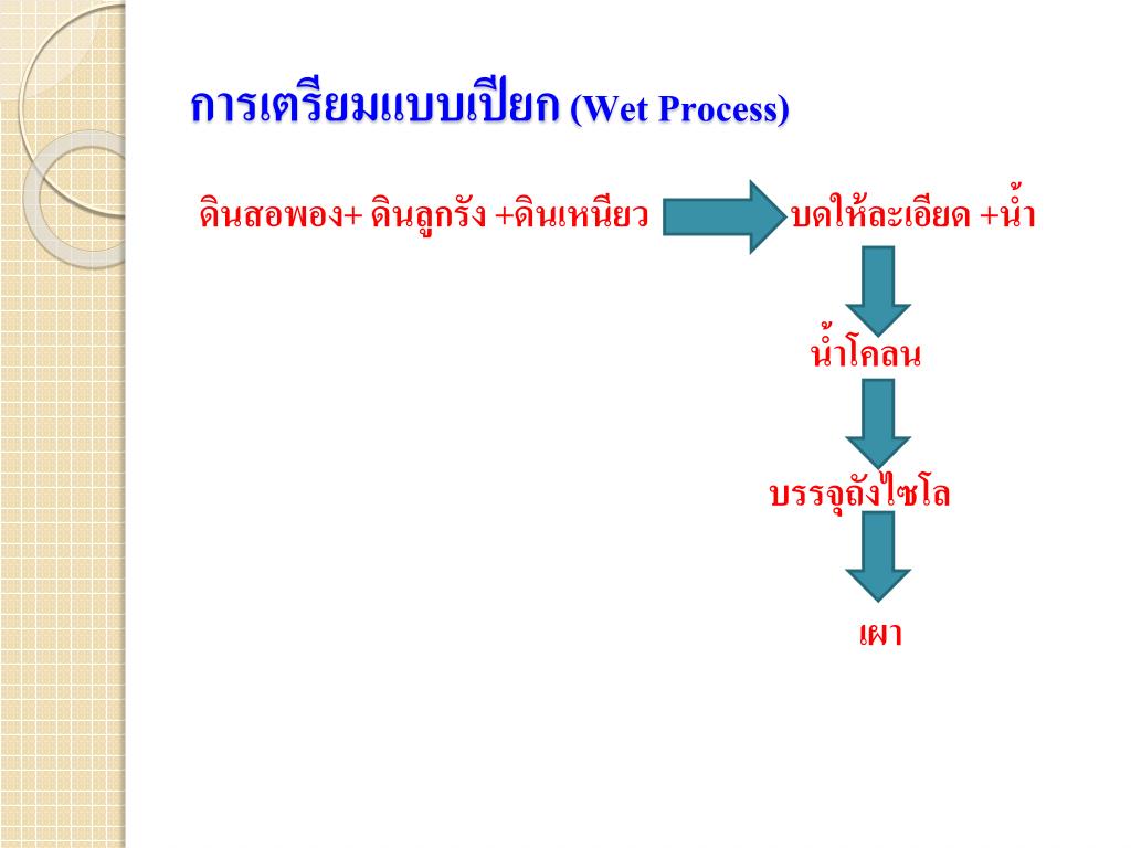 การเตรียมแบบเปียก (Wet Process) ดินสอพอง+ ดินลูกรัง +ดินเหนียว บดให้ละเอียด +น้ำ น้ำโคลน บรรจุถังไซโล เผา