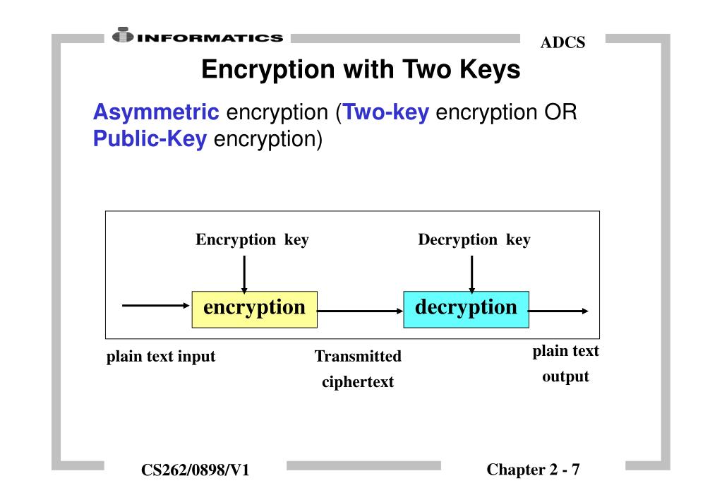 Encryption key Decryption key encryption decryption plain text output plain text input Transmitted ciphertext Encryption with Two Keys Asymmetric encryption (Two-key encryption OR Public-Key encryption)