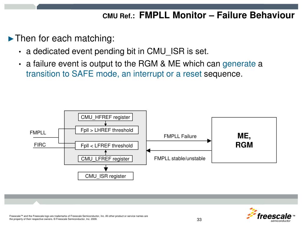 CMU Ref.: FMPLL Monitor – Frequency Range • FMPLL monitoring is enabled at CMU_CSR(CME) • Monitoring is active only when ME provides the info that FMPLL is valid. • Depending on the following conditions • If FFMPLL is lower than HLREF[11:0] bits in CMU_LFREFR • If FFMPLL is higher than HFREF[11:0] bits in CMU_HFREFR