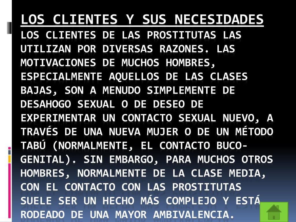 LOS CLIENTES Y SUS NECESIDADESLos clientes de las prostitutas las utilizan por diversas razones. Las motivaciones de muchos hombres, especialmente aquellos de las clases bajas, son a menudo simplemente de desahogo sexual o de deseo de experimentar un contacto sexual nuevo, a través de una nueva mujer o de un método tabú (normalmente, el contacto buco-genital). Sin embargo, para muchos otros hombres, normalmente de la clase media, con el contacto con las prostitutas suele ser un hecho más complejo y está rodeado de una mayor ambivalencia.
