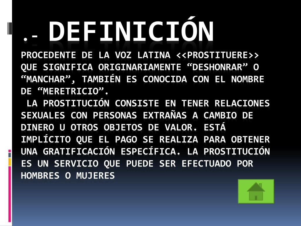 .- DEFINICIÓNProcedente de la voz latina <<prostituere>> que significa originariamente “deshonrar” o “manchar”, también es conocida con el nombre de “meretricio”.La prostitución consiste en tener relaciones sexuales con personas extrañas a cambio de dinero u otros objetos de valor. Está implícito que el pago se realiza para obtener una gratificación específica. La prostitución es un servicio que puede ser efectuado por hombres o mujeres