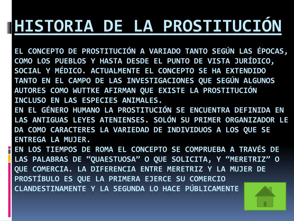 HISTORIA DE LA PROSTITUCIÓN El concepto de prostitución a variado tanto según las épocas, como los pueblos y hasta desde el punto de vista jurídico, social y médico. Actualmente el concepto se ha extendido tanto en el campo de las investigaciones que según algunos autores como Wuttke afirman que existe la prostitución incluso en las especies animales.En el género humano la prostitución se encuentra definida en las antiguas leyes atenienses. Solón su primer organizador le da como caracteres la variedad de individuos a los que se entrega la mujer.En los tiempos de Roma el concepto se comprueba a través de las palabras de “quaestuosa” o que solicita, y “meretriz” o que comercia. La diferencia entre meretriz y la mujer de prostíbulo es que la primera ejerce su comercio clandestinamente y la segunda lo hace públicamente
