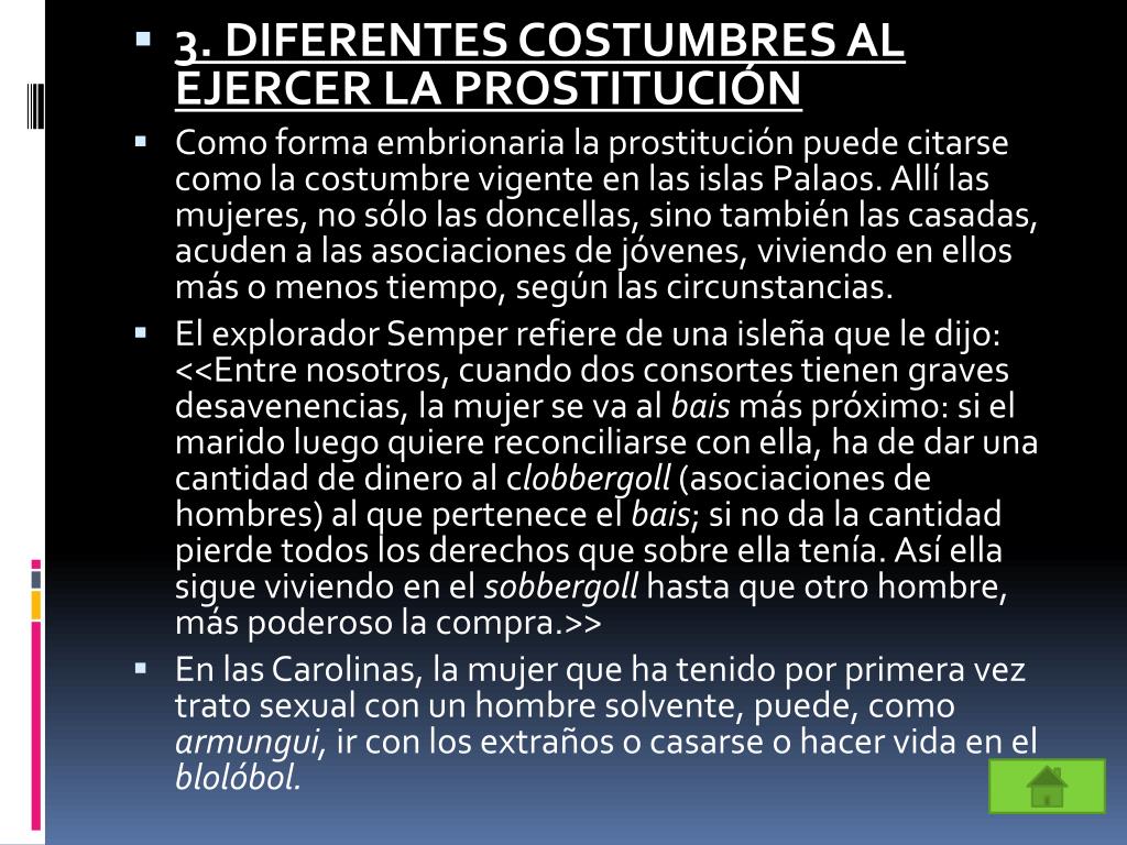 3. DIFERENTES COSTUMBRES AL EJERCER LA PROSTITUCIÓN • Como forma embrionaria la prostitución puede citarse como la costumbre vigente en las islas Palaos. Allí las mujeres, no sólo las doncellas, sino también las casadas, acuden a las asociaciones de jóvenes, viviendo en ellos más o menos tiempo, según las circunstancias. • El explorador Semper refiere de una isleña que le dijo: <<Entre nosotros, cuando dos consortes tienen graves desavenencias, la mujer se va al bais más próximo: si el marido luego quiere reconciliarse con ella, ha de dar una cantidad de dinero al clobbergoll(asociaciones de hombres) al que pertenece el bais; si no da la cantidad pierde todos los derechos que sobre ella tenía. Así ella sigue viviendo en el sobbergollhasta que otro hombre, más poderoso la compra.>> • En las Carolinas, la mujer que ha tenido por primera vez trato sexual con un hombre solvente, puede, como armungui, ir con los extraños o casarse o hacer vida en el blolóbol.