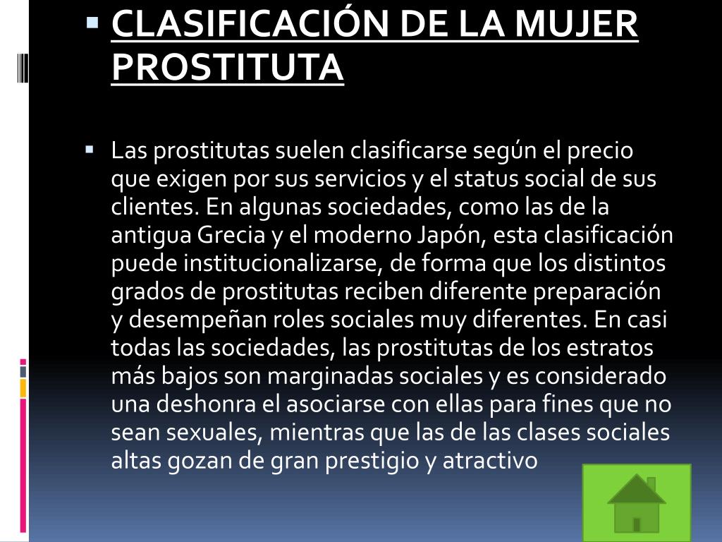 CLASIFICACIÓN DE LA MUJER PROSTITUTA • Las prostitutas suelen clasificarse según el precio que exigen por sus servicios y el status social de sus clientes. En algunas sociedades, como las de la antigua Grecia y el moderno Japón, esta clasificación puede institucionalizarse, de forma que los distintos grados de prostitutas reciben diferente preparación y desempeñan roles sociales muy diferentes. En casi todas las sociedades, las prostitutas de los estratos más bajos son marginadas sociales y es considerado una deshonra el asociarse con ellas para fines que no sean sexuales, mientras que las de las clases sociales altas gozan de gran prestigio y atractivo