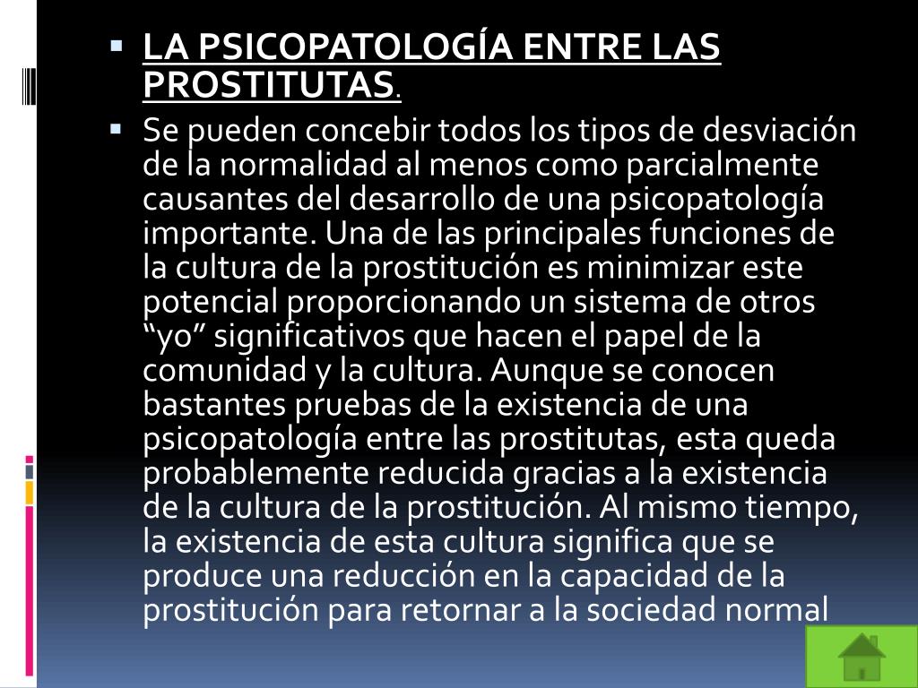 LA PSICOPATOLOGÍA ENTRE LAS PROSTITUTAS. • Se pueden concebir todos los tipos de desviación de la normalidad al menos como parcialmente causantes del desarrollo de una psicopatología importante. Una de las principales funciones de la cultura de la prostitución es minimizar este potencial proporcionando un sistema de otros “yo” significativos que hacen el papel de la comunidad y la cultura. Aunque se conocen bastantes pruebas de la existencia de una psicopatología entre las prostitutas, esta queda probablemente reducida gracias a la existencia de la cultura de la prostitución. Al mismo tiempo, la existencia de esta cultura significa que se produce una reducción en la capacidad de la prostitución para retornar a la sociedad normal