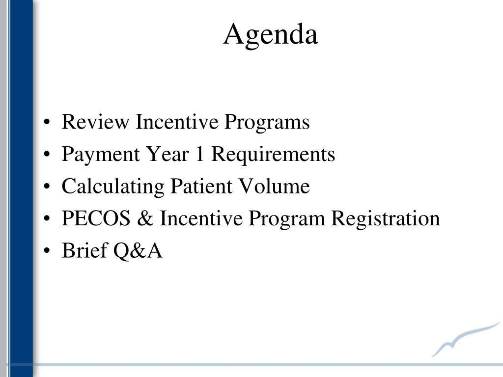 Agenda • Review Incentive Programs • Payment Year 1 Requirements • Calculating Patient Volume • PECOS & Incentive Program Registration • Brief Q&A