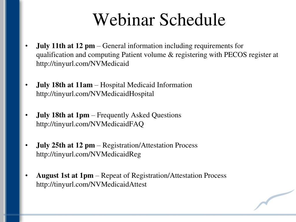 Webinar Schedule • July 11th at 12 pm – General information including requirements for qualification and computing Patient volume & registering with PECOS register at http://tinyurl.com/NVMedicaid • July 18th at 11am – Hospital Medicaid Information http://tinyurl.com/NVMedicaidHospital • July 18th at 1pm – Frequently Asked Questions http://tinyurl.com/NVMedicaidFAQ • July 25th at 12 pm – Registration/Attestation Process http://tinyurl.com/NVMedicaidReg • August 1st at 1pm – Repeat of Registration/Attestation Process http://tinyurl.com/NVMedicaidAttest