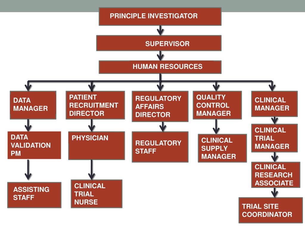 PRINCIPLE INVESTIGATOR SUPERVISOR HUMAN RESOURCES PATIENT RECRUITMENT DIRECTOR REGULATORY AFFAIRS DIRECTOR QUALITY CONTROL MANAGER CLINICAL MANAGER DATA MANAGER CLINICAL TRIAL MANAGER DATA VALIDATION PM REGULATORY STAFF PHYSICIAN CLINICAL SUPPLY MANAGER CLINICAL RESEARCH ASSOCIATE CLINICAL TRIAL NURSE ASSISTING STAFF TRIAL SITE COORDINATOR