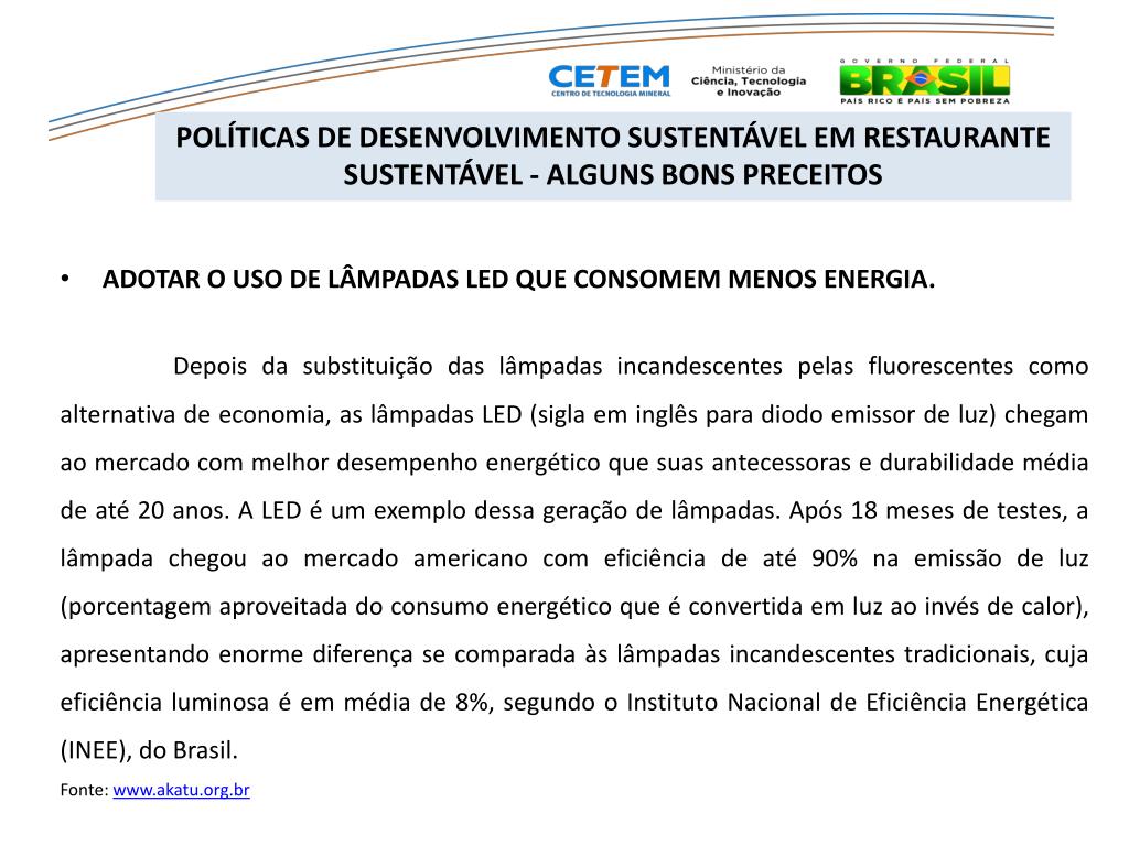 ADOTAR O USO DE LÂMPADAS LED QUE CONSOMEM MENOS ENERGIA. Depois da substituição das lâmpadas incandescentes pelas fluorescentes como alternativa de economia, as lâmpadas LED (sigla em inglês para diodo emissor de luz) chegam ao mercado com melhor desempenho energético que suas antecessoras e durabilidade média de até 20 anos. A LED é um exemplo dessa geração de lâmpadas. Após 18 meses de testes, a lâmpada chegou ao mercado americano com eficiência de até 90% na emissão de luz (porcentagem aproveitada do consumo energético que é convertida em luz ao invés de calor), apresentando enorme diferença se comparada às lâmpadas incandescentes tradicionais, cuja eficiência luminosa é em média de 8%, segundo o Instituto Nacional de Eficiência Energética (INEE), do Brasil. Fonte: www.akatu.org.br POLÍTICAS DE DESENVOLVIMENTO SUSTENTÁVEL EM RESTAURANTE SUSTENTÁVEL - ALGUNS BONS PRECEITOS