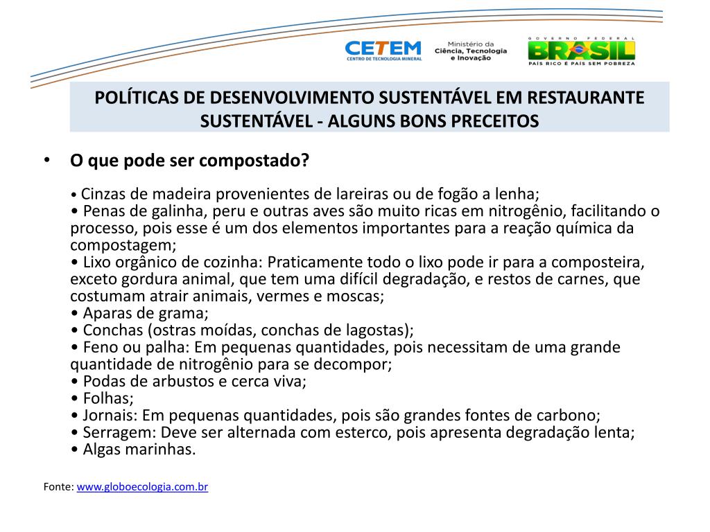 O que pode ser compostado? • Cinzas de madeira provenientes de lareiras ou de fogão a lenha;• Penas de galinha, peru e outras aves são muito ricas em nitrogênio, facilitando o processo, pois esse é um dos elementos importantes para a reação química da compostagem;• Lixo orgânico de cozinha: Praticamente todo o lixo pode ir para a composteira, exceto gordura animal, que tem uma difícil degradação, e restos de carnes, que costumam atrair animais, vermes e moscas;• Aparas de grama;• Conchas (ostras moídas, conchas de lagostas);• Feno ou palha: Em pequenas quantidades, pois necessitam de uma grande quantidade de nitrogênio para se decompor;• Podas de arbustos e cerca viva;• Folhas;• Jornais: Em pequenas quantidades, pois são grandes fontes de carbono;• Serragem: Deve ser alternada com esterco, pois apresenta degradação lenta;• Algas marinhas. Fonte: www.globoecologia.com.br POLÍTICAS DE DESENVOLVIMENTO SUSTENTÁVEL EM RESTAURANTE SUSTENTÁVEL - ALGUNS BONS PRECEITOS