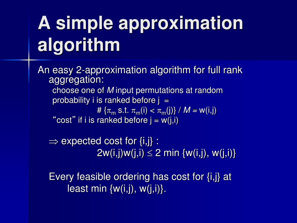 A simple approximation algorithm An easy 2-approximation algorithm for full rank aggregation: choose one of M input permutations at random probability i is ranked before j = # {m s.t. m(i) < m(j)} / M = w(i,j) “cost” if i is ranked before j = w(j,i) expected cost for {i,j} : 2w(i,j)w(j,i) 2 min {w(i,j), w(j,i)} Every feasible ordering has cost for {i,j} at least min {w(i,j), w(j,i)}.