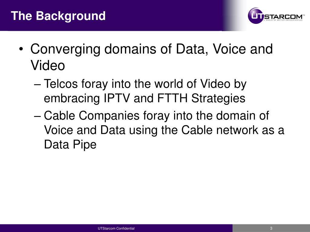 The Background • Converging domains of Data, Voice and Video • Telcos foray into the world of Video by embracing IPTV and FTTH Strategies • Cable Companies foray into the domain of Voice and Data using the Cable network as a Data Pipe UTStarcom Confidential