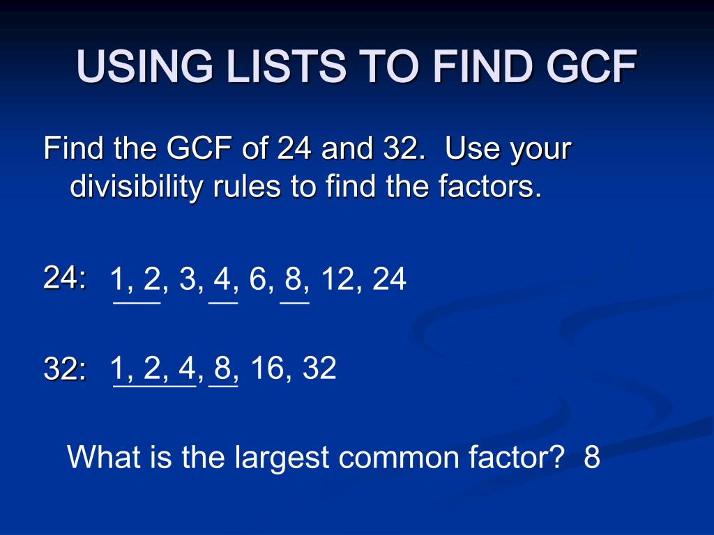 USING LISTS TO FIND GCF Find the GCF of 24 and 32. Use your divisibility rules to find the factors. 24: 32: 1, 2, 3, 4, 6, 8, 12, 24 1, 2, 4, 8, 16, 32 What is the largest common factor? 8