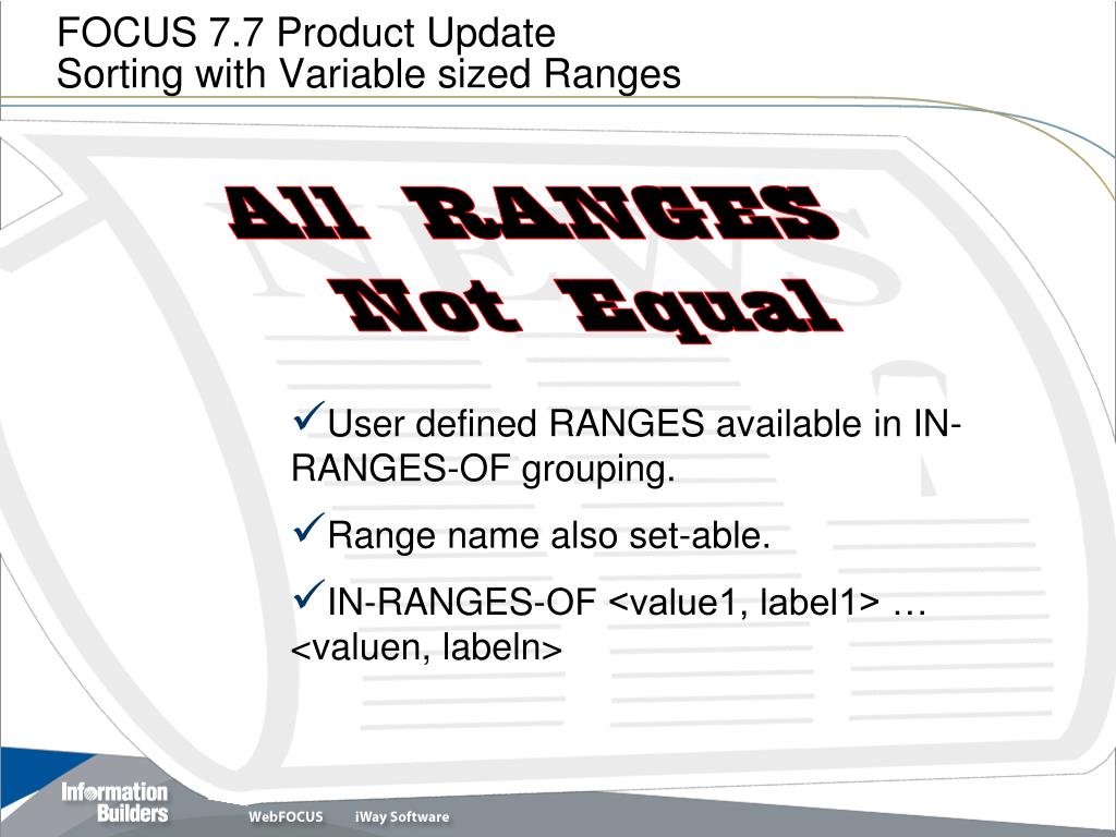 FOCUS 7.7 Product UpdateSorting with Variable sized Ranges All RANGES Not Equal • User defined RANGES available in IN-RANGES-OF grouping. • Range name also set-able. • IN-RANGES-OF <value1, label1> … <valuen, labeln>