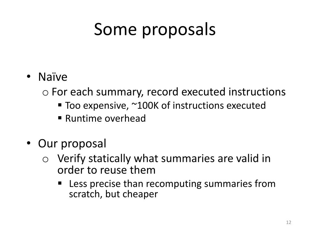 Some proposals • Naïve • For each summary, record executed instructions • Too expensive, ~100K of instructions executed • Runtime overhead • Our proposal • Verifystatically what summaries are valid in order to reuse them • Less precise than recomputing summaries from scratch, but cheaper