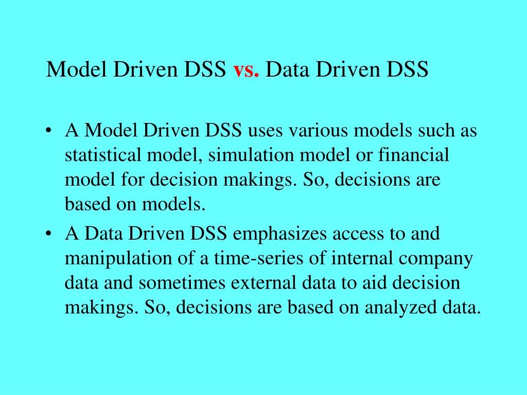 Model Driven DSS vs.Data Driven DSS A Model Driven DSS uses various models such as statistical model, simulation model or financial modelfor decision makings. So, decisions are based on models. A Data Driven DSS emphasizes access to and manipulation of a time-series of internal company data and sometimes external data to aid decision makings. So, decisions are based on analyzed data.