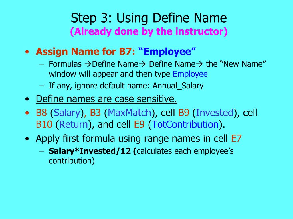 Step 3: Using Define Name(Already done by the instructor) • Assign Name for B7:“Employee” • Formulas Define Name Define Name the “New Name” window will appear and then type Employee • If any, ignore default name: Annual_Salary • Define names are case sensitive. • B8 (Salary), B3 (MaxMatch), cell B9 (Invested), cell B10 (Return), and cell E9 (TotContribution). • Apply first formula using range names in cell E7 • Salary*Invested/12 (calculates each employee’s contribution)