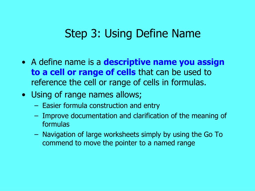 Step 3: Using Define Name • A define name is a descriptive name you assign to a cell or range of cells that can be used to reference the cell or range of cells in formulas. • Using of range names allows; • Easier formula construction and entry • Improve documentation and clarification of the meaning of formulas • Navigation of large worksheets simply by using the Go To commend to move the pointer to a named range