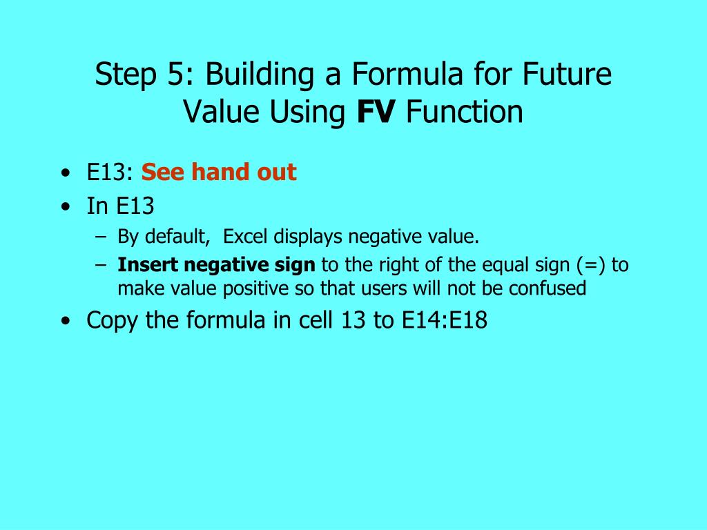 Step 5: Building a Formula for Future Value Using FV Function • E13: See hand out • In E13 • By default, Excel displays negative value. • Insert negative sign to the right of the equal sign (=) to make value positive so that users will not be confused • Copy the formula in cell 13 to E14:E18