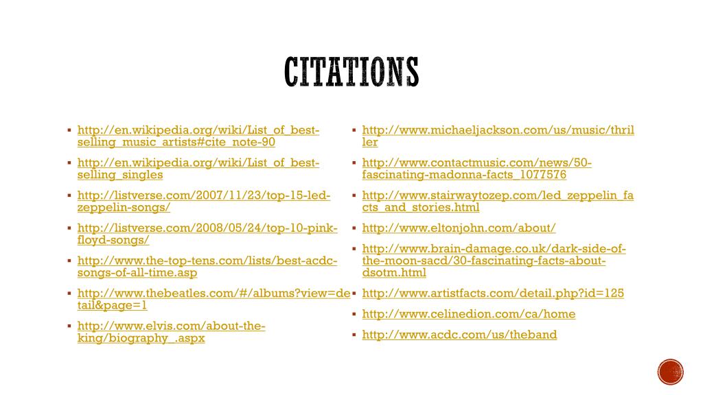 Citations • http://en.wikipedia.org/wiki/List_of_best-selling_music_artists#cite_note-90 • http://en.wikipedia.org/wiki/List_of_best-selling_singles • http://listverse.com/2007/11/23/top-15-led-zeppelin-songs/ • http://listverse.com/2008/05/24/top-10-pink-floyd-songs/ • http://www.the-top-tens.com/lists/best-acdc-songs-of-all-time.asp • http://www.thebeatles.com/#/albums?view=detail&page=1 • http://www.elvis.com/about-the-king/biography_.aspx • http://www.michaeljackson.com/us/music/thriller • http://www.contactmusic.com/news/50-fascinating-madonna-facts_1077576 • http://www.stairwaytozep.com/led_zeppelin_facts_and_stories.html • http://www.eltonjohn.com/about/ • http://www.brain-damage.co.uk/dark-side-of-the-moon-sacd/30-fascinating-facts-about-dsotm.html • http://www.artistfacts.com/detail.php?id=125 • http://www.celinedion.com/ca/home • http://www.acdc.com/us/theband
