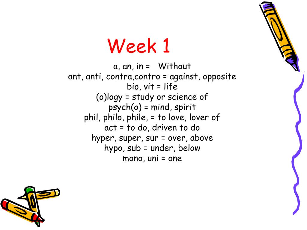 Week 1 a, an, in = Without ant, anti, contra,contro = against, opposite bio, vit = life (o)logy = study or science of psych(o) = mind, spirit phil, philo, phile, = to love, lover of act = to do, driven to do hyper, super, sur = over, above hypo, sub = under, below mono, uni = one