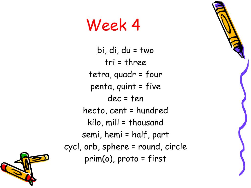 Week 4 bi, di, du = two tri = three tetra, quadr = four penta, quint = five dec = ten hecto, cent = hundred kilo, mill = thousand semi, hemi = half, part cycl, orb, sphere = round, circle prim(o), proto = first