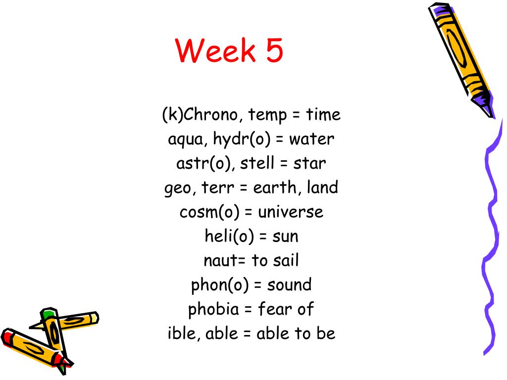 Week 5 (k)Chrono, temp = time aqua, hydr(o) = water astr(o), stell = star geo, terr = earth, land cosm(o) = universe heli(o) = sun naut= to sail phon(o) = sound phobia = fear of ible, able = able to be