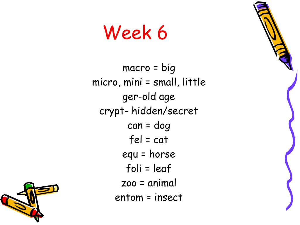 Week 6 macro = big micro, mini = small, little ger-old age crypt- hidden/secret can = dog fel = cat equ = horse foli = leaf zoo = animal entom = insect