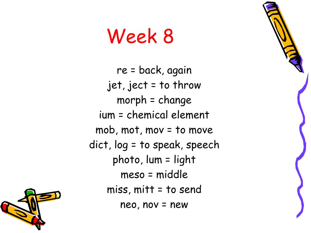 Week 8 re = back, again jet, ject = to throw morph = change ium = chemical element mob, mot, mov = to move dict, log = to speak, speech photo, lum = light meso = middle miss, mitt = to send neo, nov = new