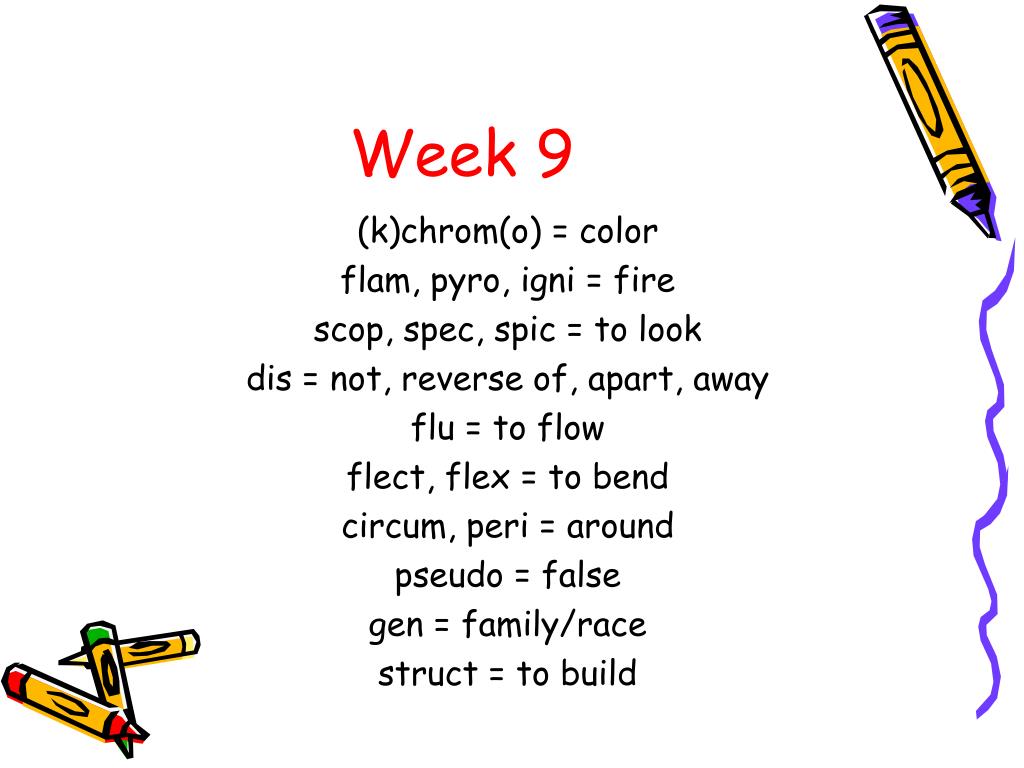 Week 9 (k)chrom(o) = color flam, pyro, igni = fire scop, spec, spic = to look dis = not, reverse of, apart, away flu = to flow flect, flex = to bend circum, peri = around pseudo = false gen = family/race struct = to build