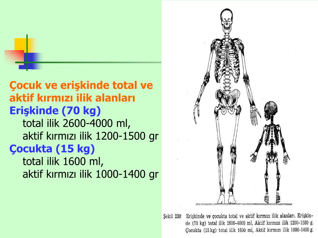 Çocuk ve erişkinde total ve aktif kırmızı ilik alanları Erişkinde (70 kg) total ilik 2600-4000 ml, aktif kırmızı ilik 1200-1500 gr Çocukta (15 kg) total ilik 1600 ml, aktif kırmızı ilik 1000-1400 gr