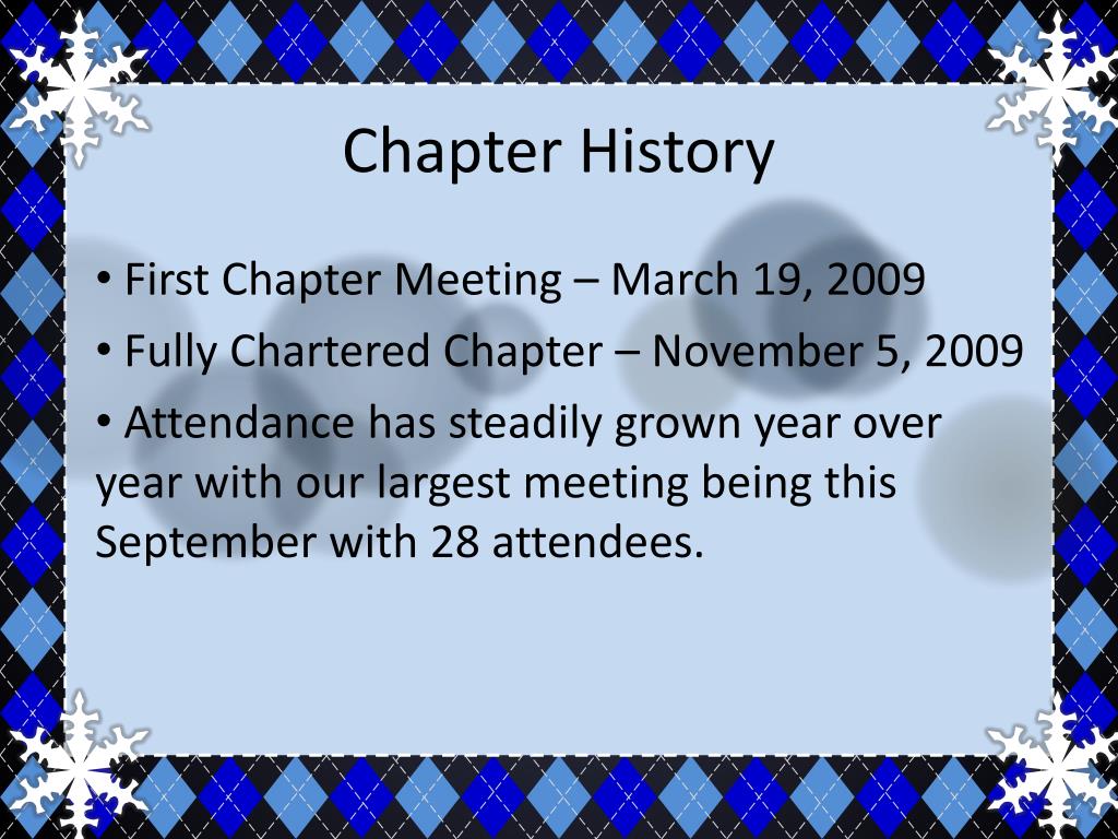 Chapter History First Chapter Meeting – March 19, 2009 Fully Chartered Chapter – November 5, 2009 Attendance has steadily grown year over year with our largest meeting being this September with 28 attendees.