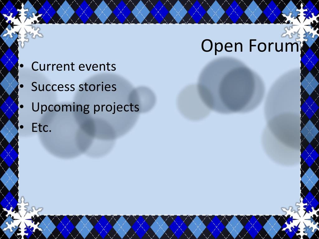 Open Forum • Current events • Success stories • Upcoming projects • Etc.
