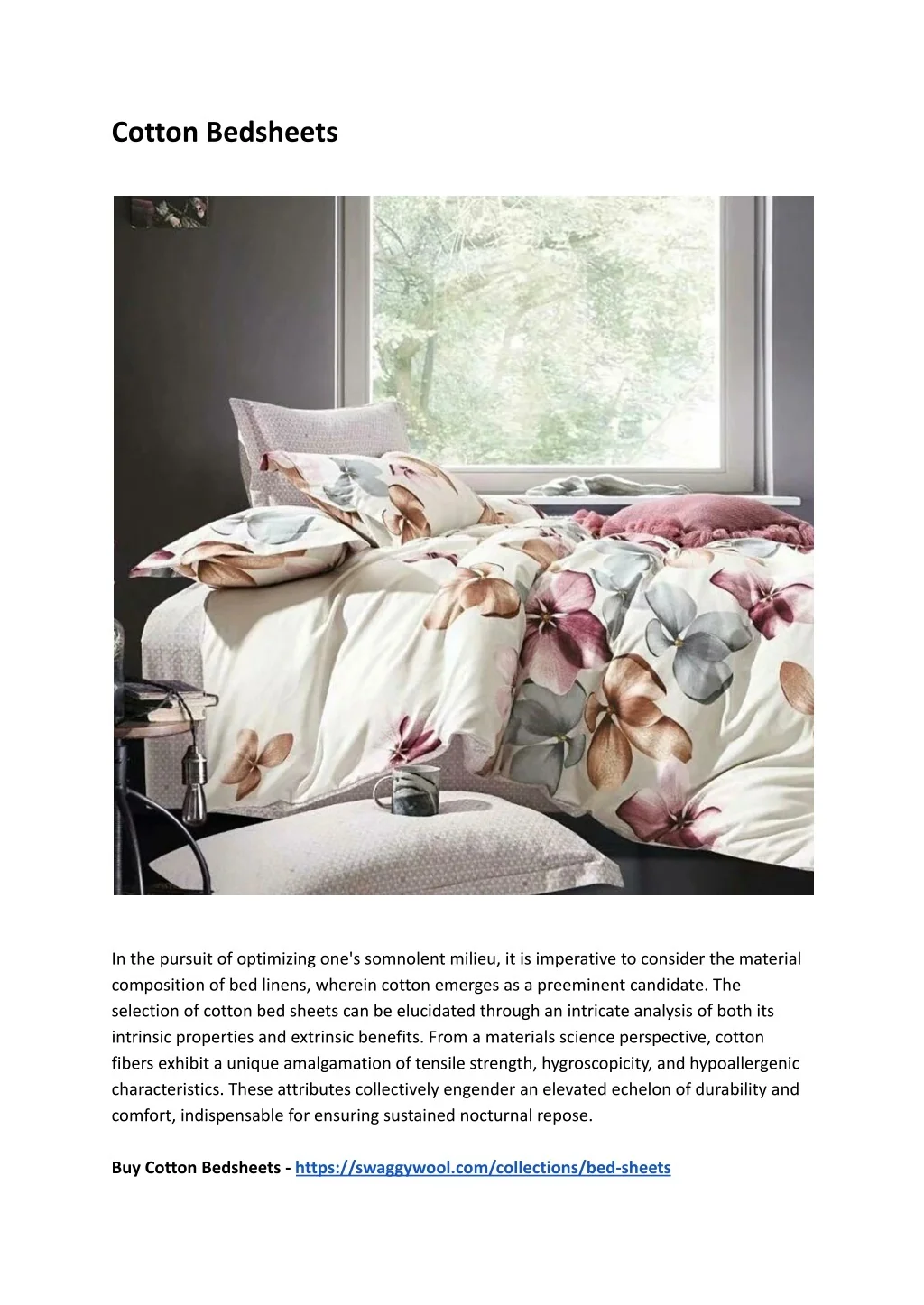 Cotton Bedsheets In the pursuit of optimizing one's somnolent milieu, it is imperative to consider the material composition of bed linens, wherein cotton emerges as a preeminent candidate. The selection of cotton bed sheets can be elucidated through an intricate analysis of both its intrinsic properties and extrinsic benefits. From a materials science perspective, cotton fibers exhibit a unique amalgamation of tensile strength, hygroscopicity, and hypoallergenic characteristics. These attributes collectively engender an elevated echelon of durability and comfort, indispensable for ensuring sustained nocturnal repose. Buy Cotton Bedsheets - https://swaggywool.com/collections/bed-sheets