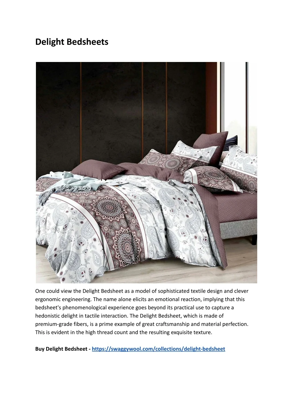 Delight Bedsheets One could view the Delight Bedsheet as a model of sophisticated textile design and clever ergonomic engineering. The name alone elicits an emotional reaction, implying that this bedsheet's phenomenological experience goes beyond its practical use to capture a hedonistic delight in tactile interaction. The Delight Bedsheet, which is made of premium-grade fibers, is a prime example of great craftsmanship and material perfection. This is evident in the high thread count and the resulting exquisite texture. Buy Delight Bedsheet - https://swaggywool.com/collections/delight-bedsheet