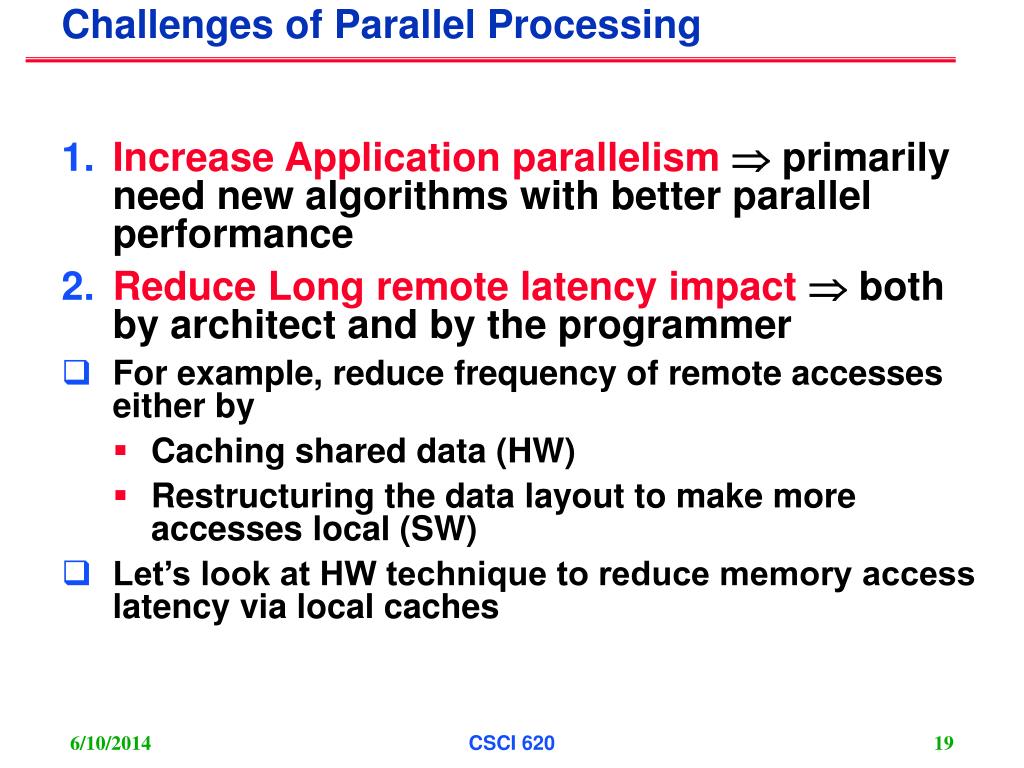 Challenges of Parallel Processing • Increase Application parallelism primarily need new algorithms with better parallel performance • Reduce Long remote latency impact both by architect and by the programmer • For example, reduce frequency of remote accesses either by • Caching shared data (HW) • Restructuring the data layout to make more accesses local (SW) • Let’s look at HW technique to reduce memory access latency via local caches CSCI 620