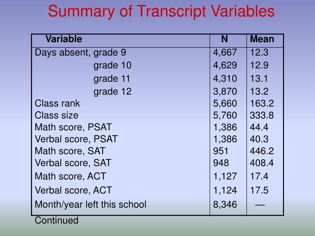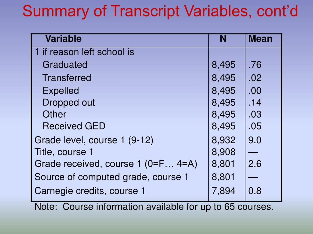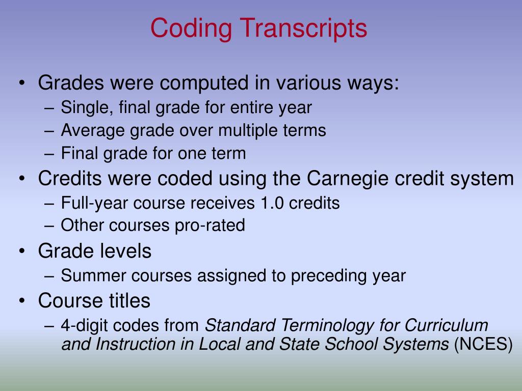 Coding Transcripts • Grades were computed in various ways: • Single, final grade for entire year • Average grade over multiple terms • Final grade for one term • Credits were coded using the Carnegie credit system • Full-year course receives 1.0 credits • Other courses pro-rated • Grade levels • Summer courses assigned to preceding year • Course titles • 4-digit codes from Standard Terminology for Curriculum and Instruction in Local and State School Systems (NCES)