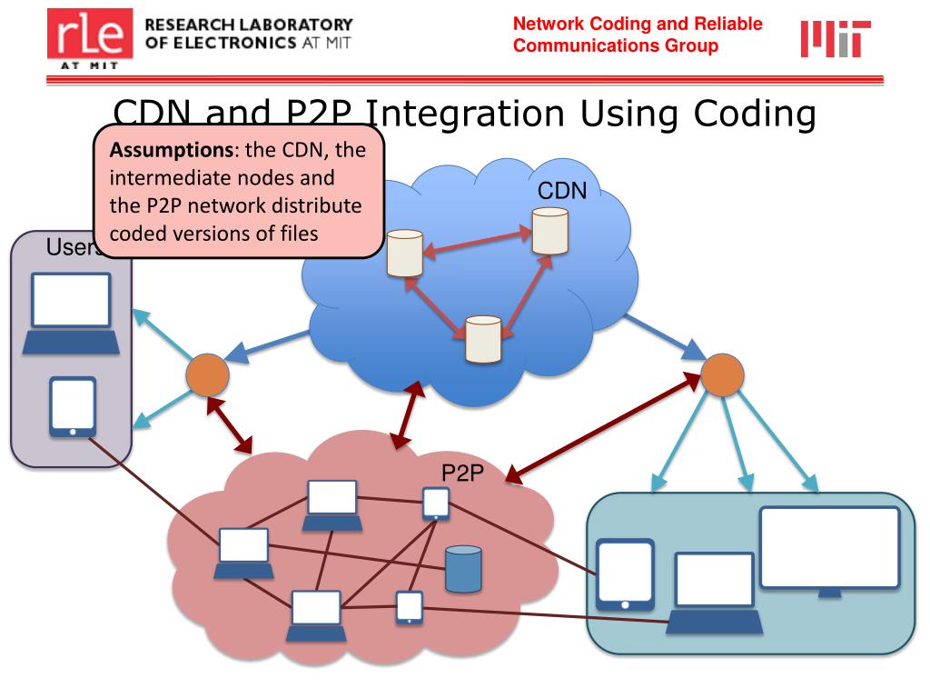 CDN and P2P Integration Using Coding Assumptions: the CDN, the intermediate nodes and the P2P network distribute coded versions of files CDN Users P2P