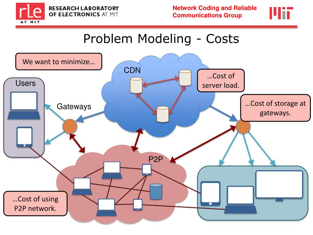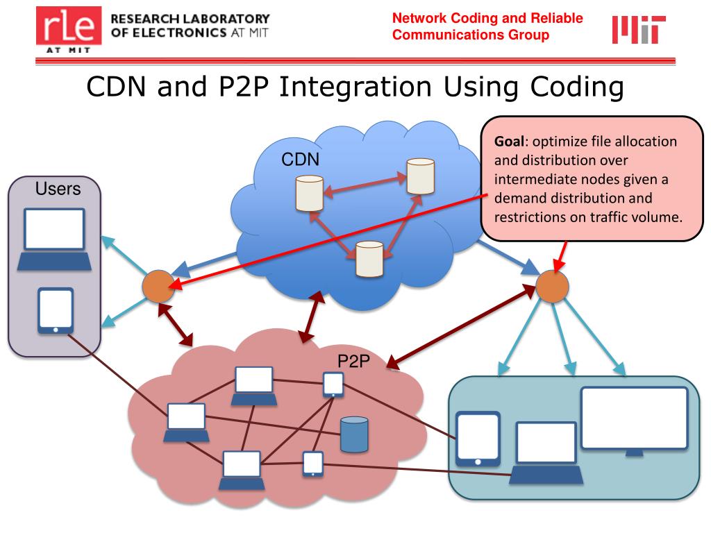CDN and P2P Integration Using Coding Goal: optimize file allocation and distribution over intermediate nodes given a demand distribution and restrictions on traffic volume. Users CDN P2P