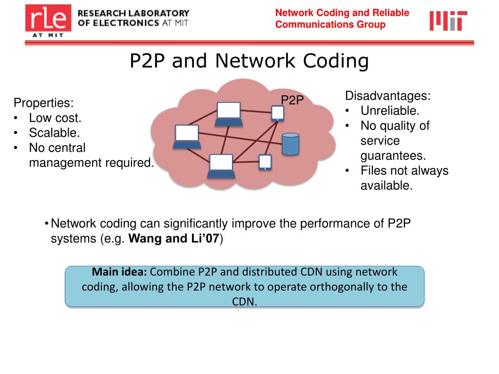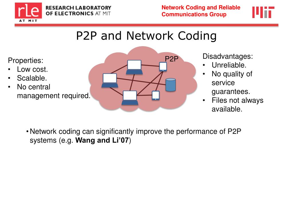 P2P and Network Coding • Disadvantages: • Unreliable. • No quality of service guarantees. • Files not always available. • Properties: • Low cost. • Scalable. • No central management required. • Network coding can significantly improve the performance of P2P systems (e.g. Wang and Li’07) P2P