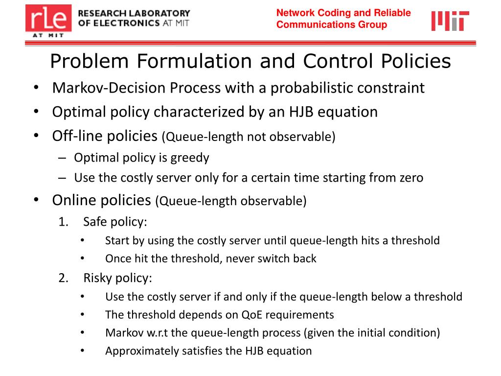 Problem Formulation and Control Policies • Markov-Decision Process with a probabilistic constraint • Optimal policy characterized by an HJB equation • Off-line policies (Queue-length not observable) • Optimal policy is greedy • Use the costly server only for a certain time starting from zero • Online policies (Queue-length observable) • Safe policy: • Start by using the costly server until queue-length hits a threshold • Once hit the threshold, never switch back • Risky policy: • Use the costly server if and only if the queue-length below a threshold • The threshold depends on QoE requirements • Markov w.r.t the queue-length process (given the initial condition) • Approximately satisfies the HJB equation